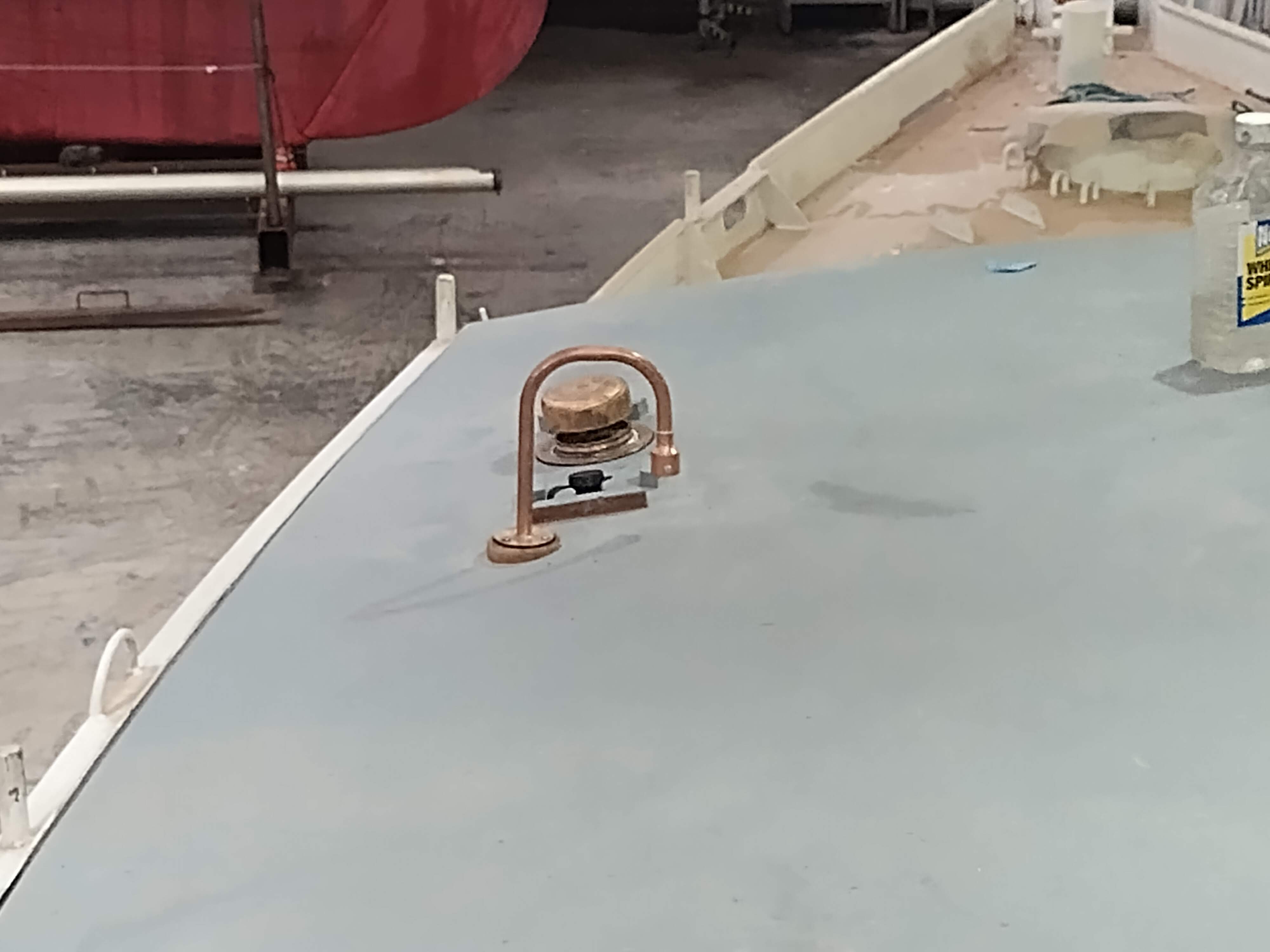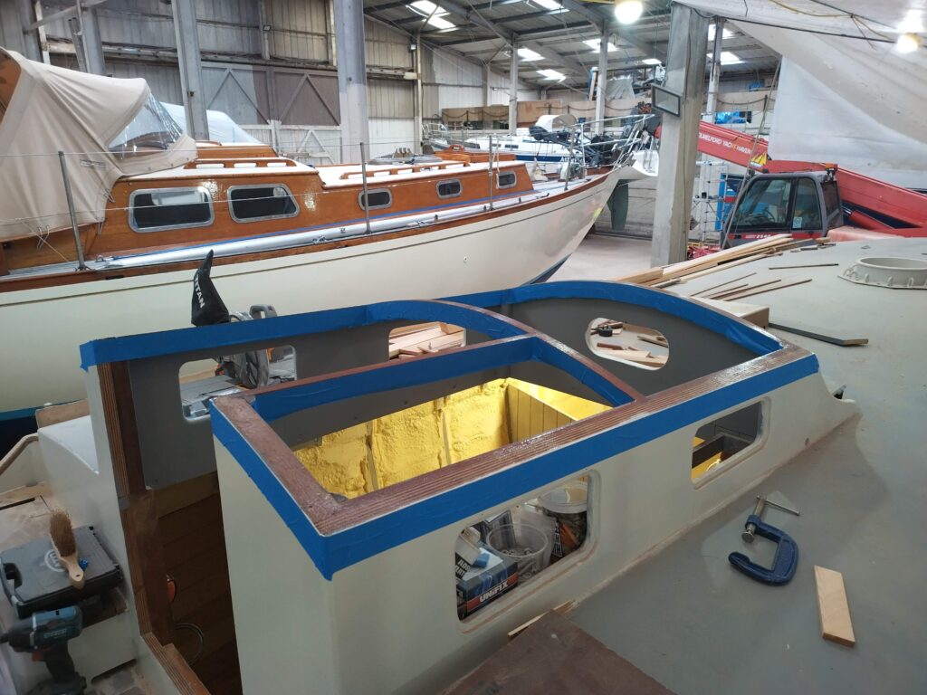 Next came the layer of glassfibre to strengthen and protect the ply – this was one layer of 450gsm woven roving. Again, a “primer” layer of resin came first, then once that had gone tacky, more resin was applied and the cloth itself, then even more resin, squeegeed into the weave to ensure full saturation. Once cured, a wash (warm soapy water followed by fresh water gets the amine off), then a sand (more itchy dust), and more epoxy followed. After another sand, the weave of the cloth was still evident, so my next coat of resin included some low density filler powder to fair out the weave. More sanding, then voila, a smooth roof, ready for some paint. I gave it a couple of good coats of high-build epoxy primer, then after more sanding, I applied a coat of topcoat to the top edges of the doghouse sides (to match the rest), and at the same time, finally gave the waiting Dorade boxes a first topcoat. These will get a second coat before they can be finally fitted with their cowls and the forward ones with the nav lights. Then, before they can be attached to the deck, the deck itself will need a couple of topcoats (with non-slip), so this may be a good job to tackle next time I’m home. The deck will receive a final topcoat right before the boat leaves the shed, as there will between now and then be lots more interruptions, holes cut, epoxy spilt and general mess made, but at least with a couple of coats I can start fixing things to the deck in earnest, progressing the deck fit-out as well as down below.